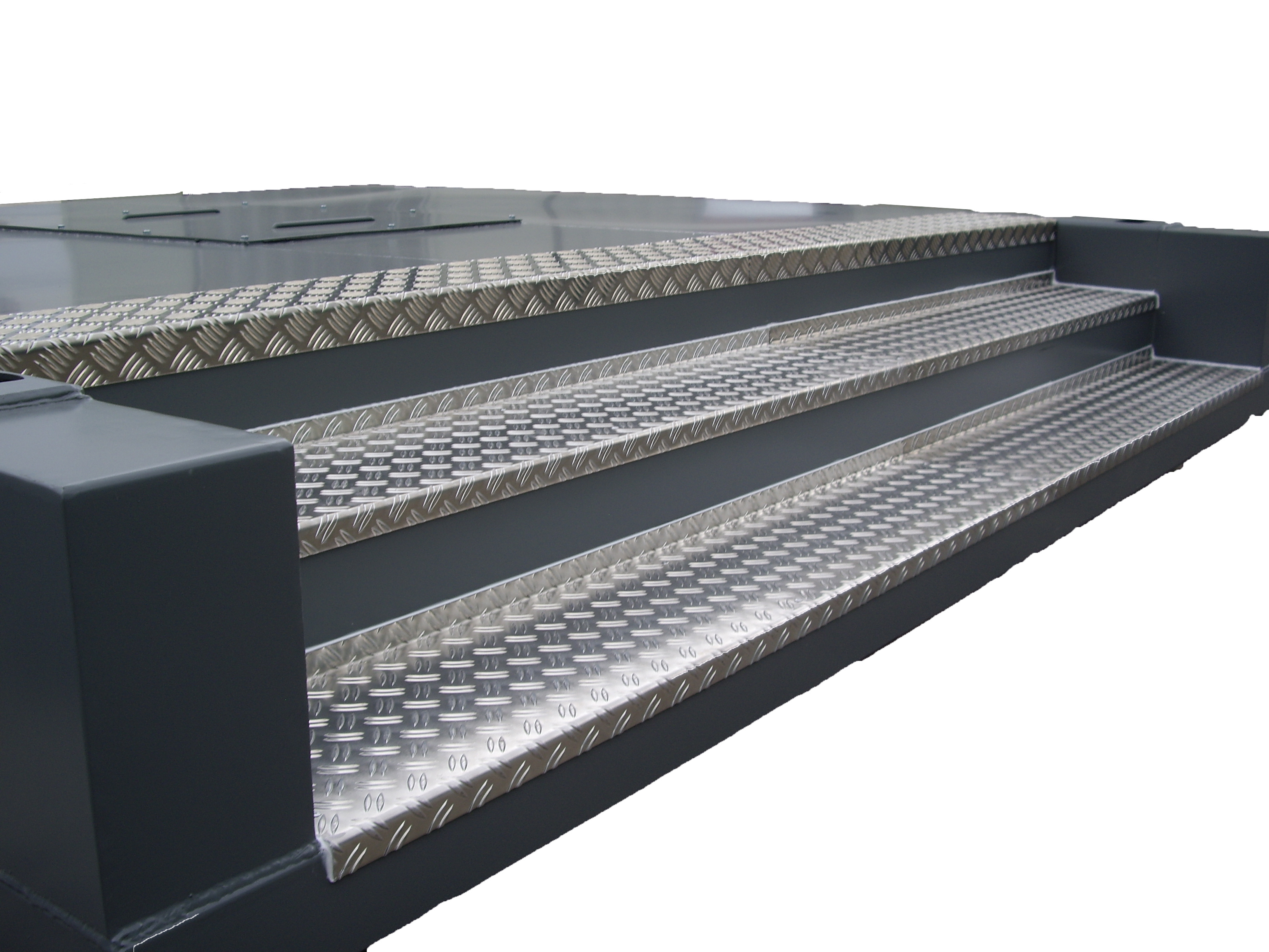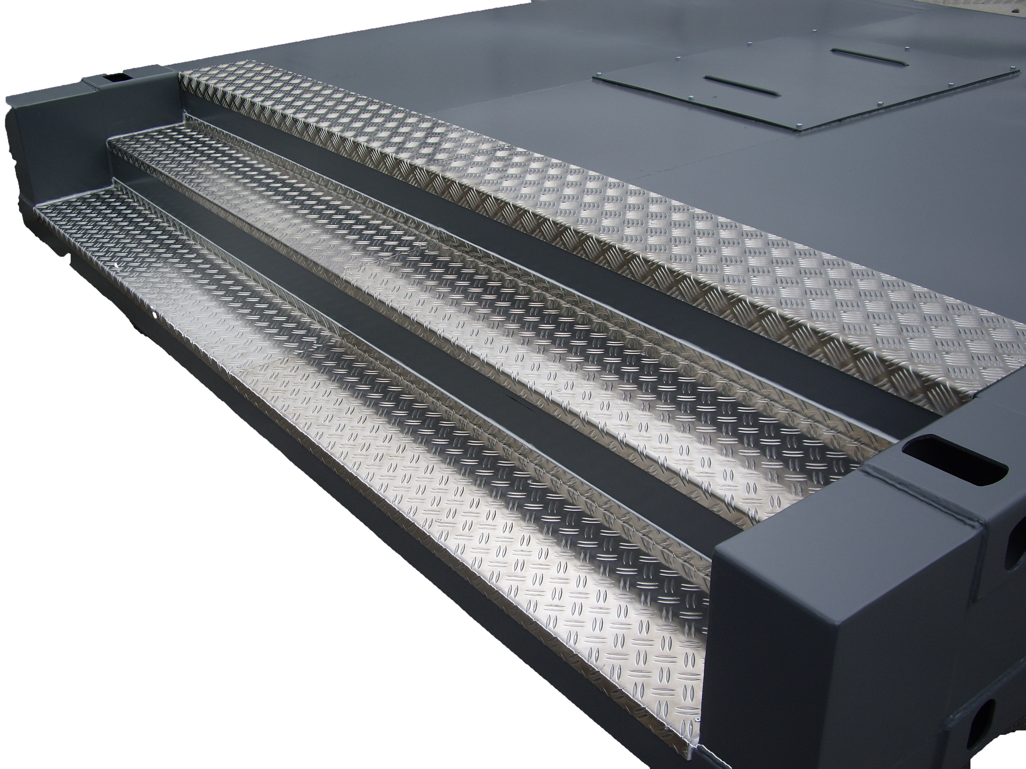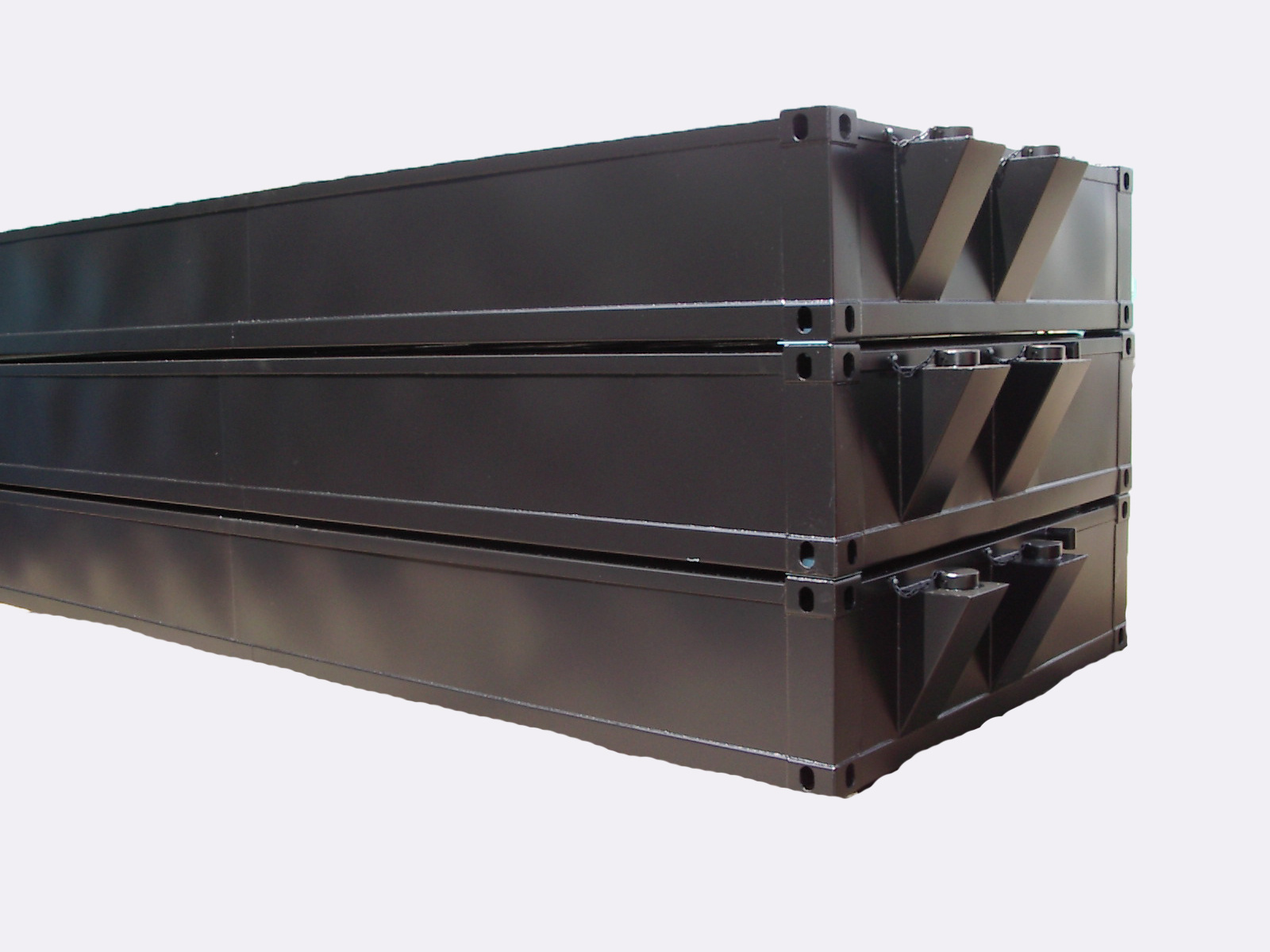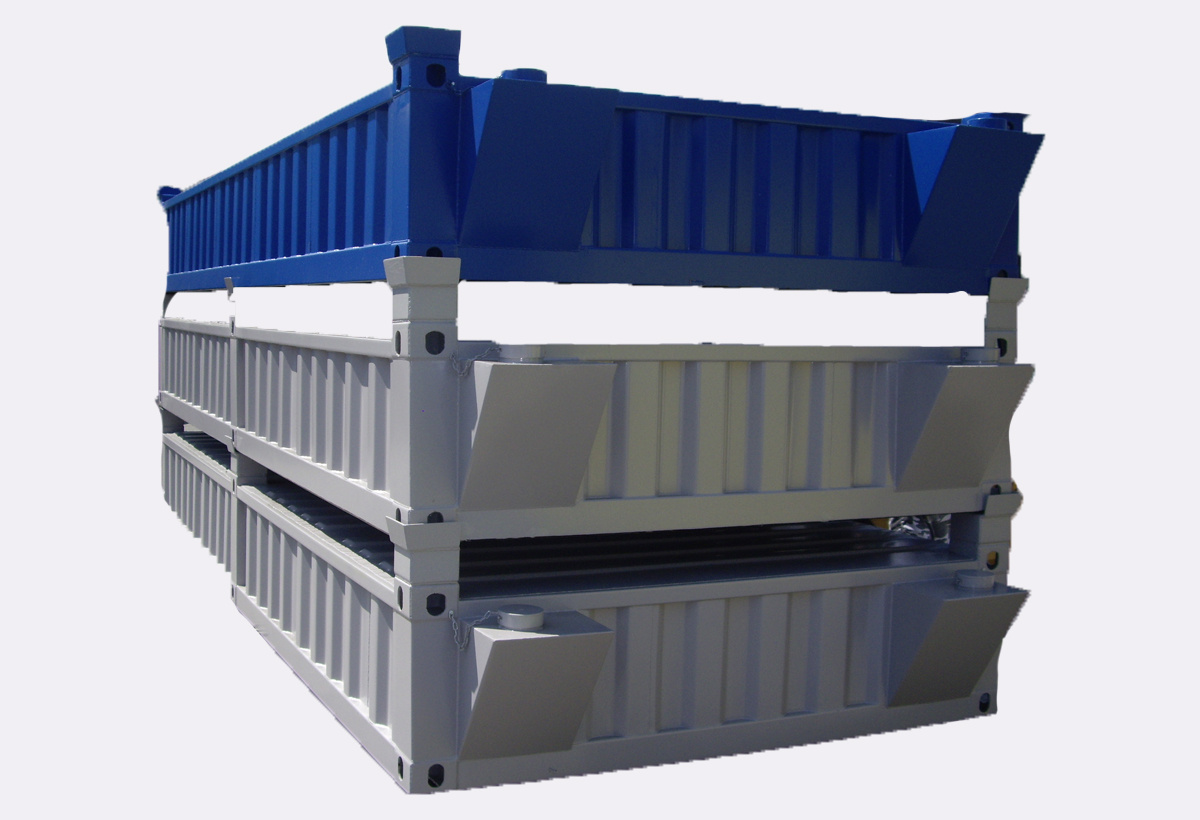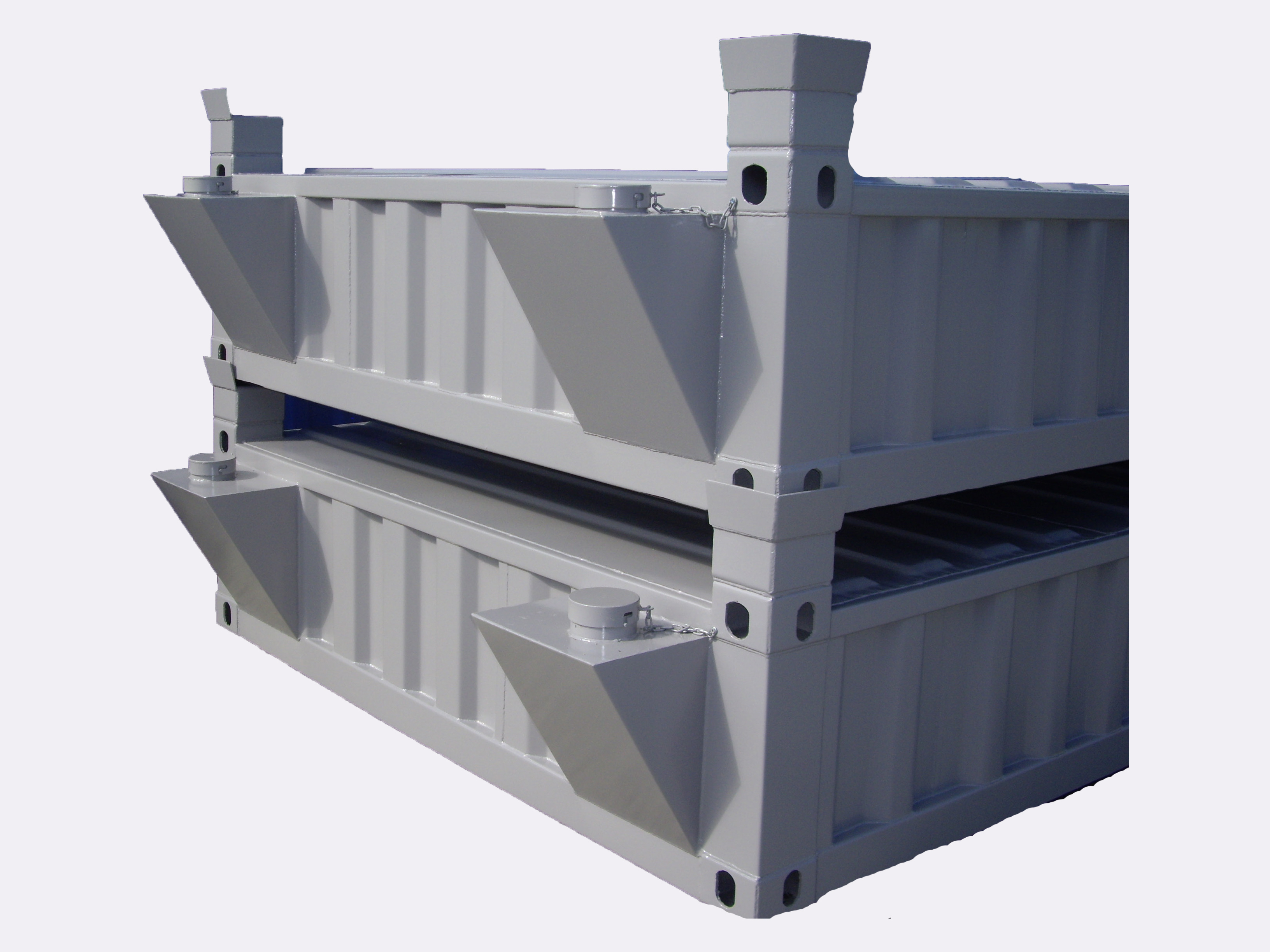 - Es besteht aus gebogenen Stahlprofilen mit einer Dicke von 3 mm, mit verschweißten Eckwürfel 6 mm oder ISO - Gussecken und Gabelstapler Öffnungen.